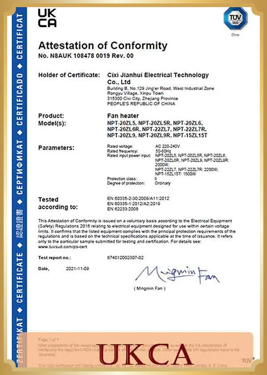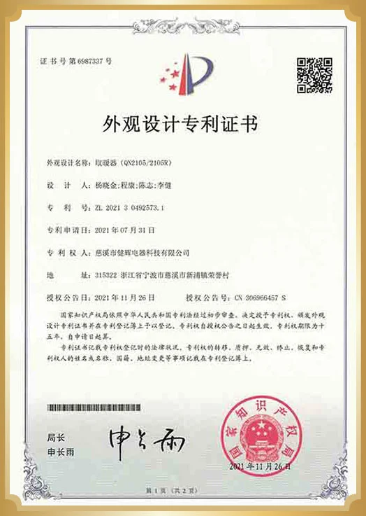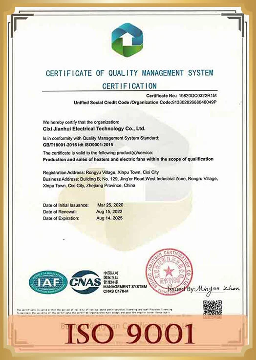 Công ty TNHH Công nghệ điện Cixi Jianhui đã hoạt động theo BSCI, Hệ thống quản lý chất lượng ISO9001 và PAH và các quốc gia khác. Hầu hết các sản phẩm đã thông qua chứng nhận CE, CB, GS, Reach, ROHS2.0, CCC, EMC và có một số bằng sáng chế thiết kế.